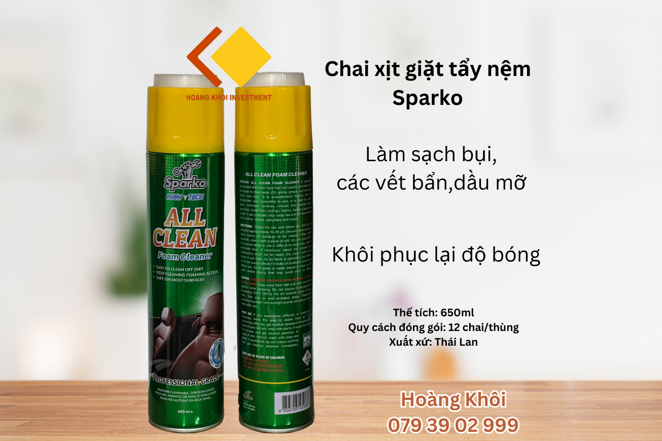 Chai giặt tẩy nệm Sparko All Clean Foam Cleaner là một sản phẩm chăm sóc nệm của thương hiệu Sparko-được phân phối bởi Vật tư Hoàng Khôi. Sản phẩm được thiết kế để loại bỏ các vết bẩn, mùi hôi khó chịu và các tác nhân gây dị ứng, sản phẩm này giúp cho nệm của bạn luôn sạch sẽ và thoải mái.